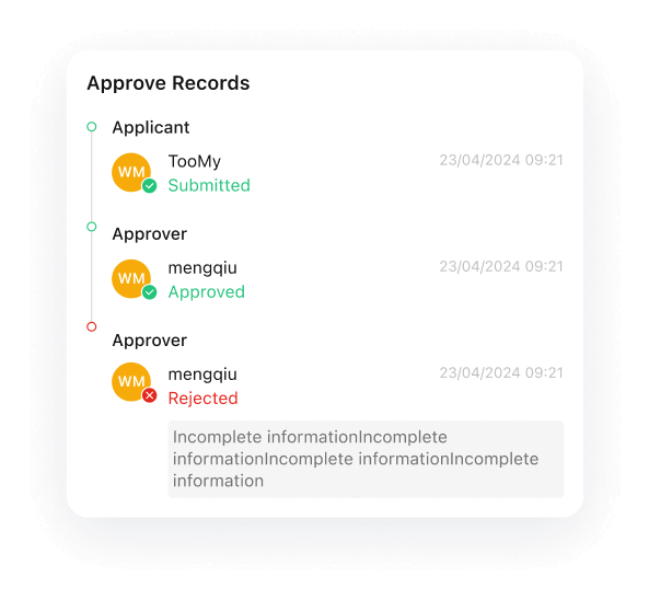 Clone past approvals (e.g., onboarding kits, travel reimbursements) with preset workflows. Update names/dates, auto-trigger approval chains, and add comments like “Same as last month!” – eliminate repetitive work.